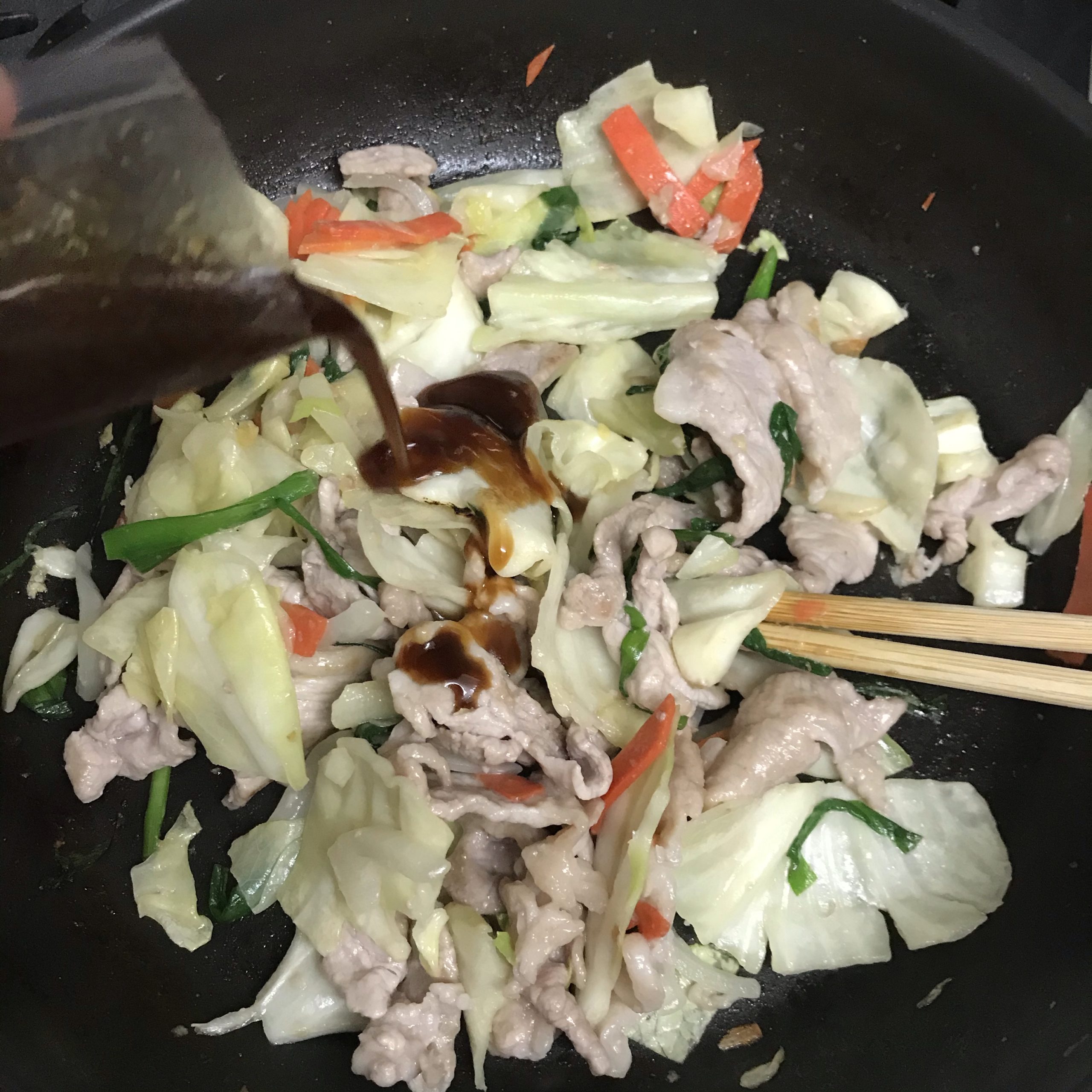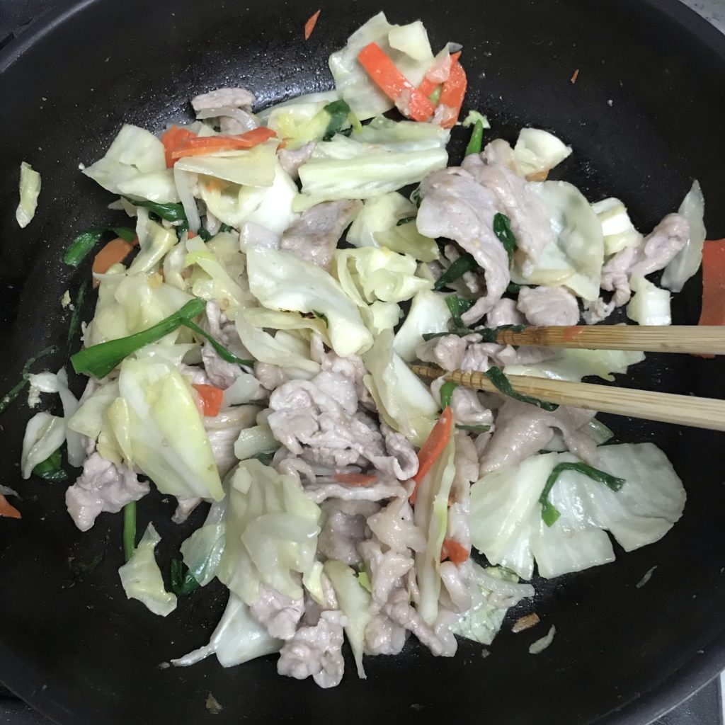 豚肉の色が変わるまで炒める